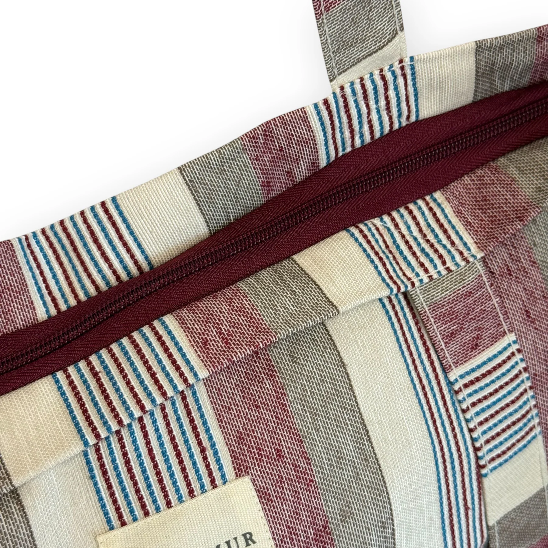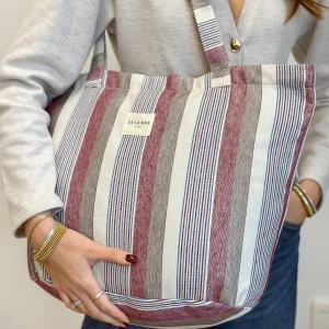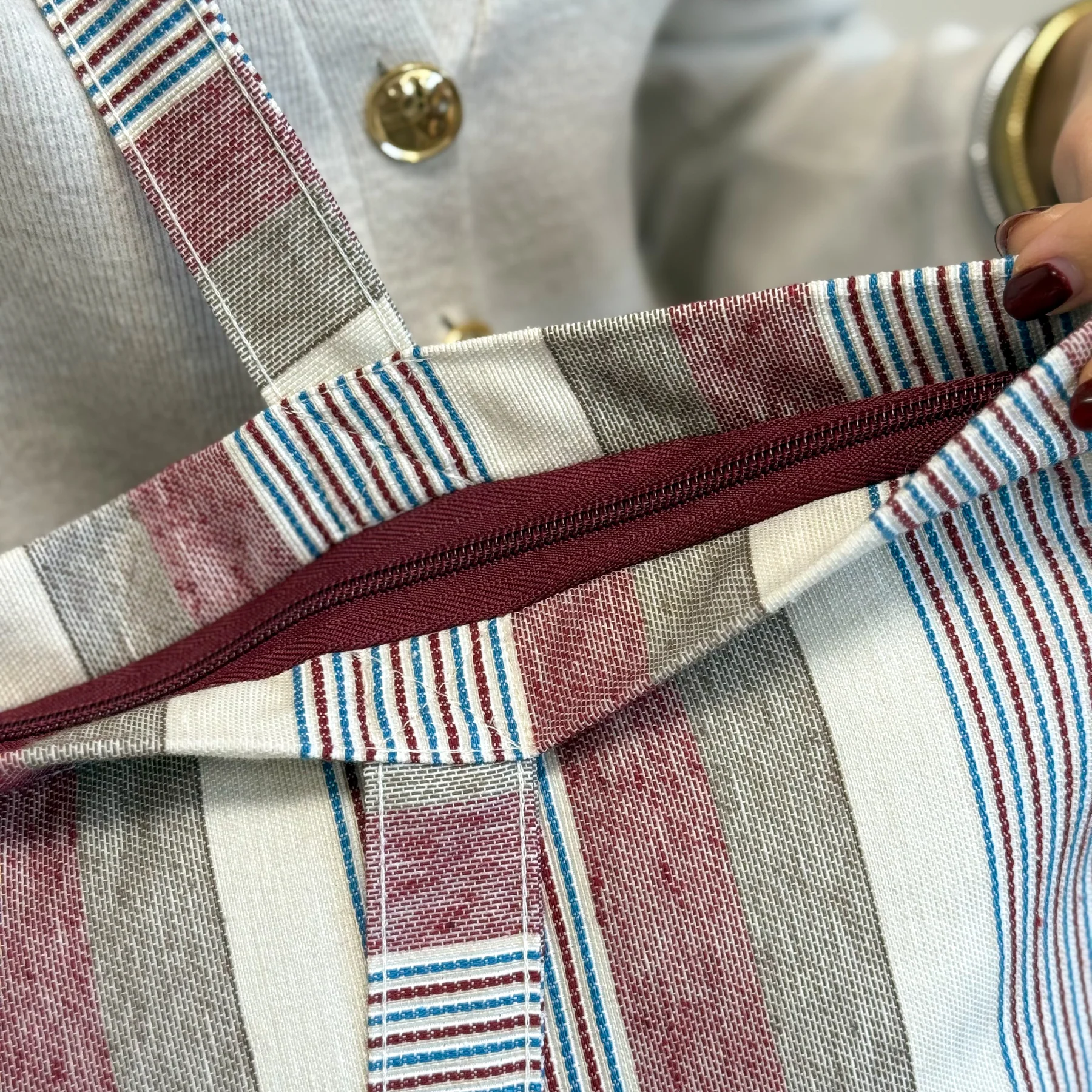Su diseño de rayas en tonos granate, azul, beige y crudo aporta un estilo elegante y atemporal que combina con todo, tanto con looks casual como más arreglados.