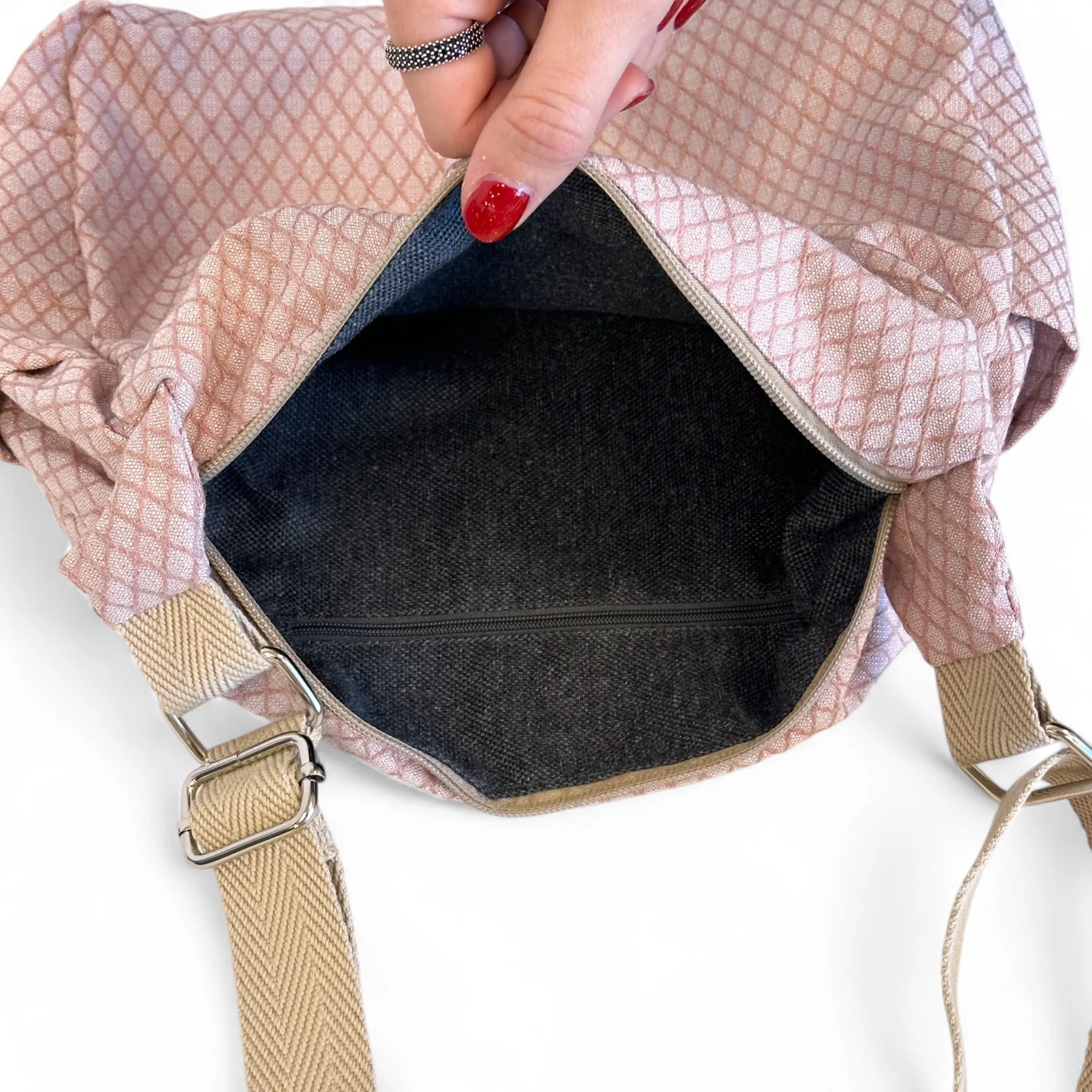 El cierre superior con cremallera mantiene tus cosas seguras, y el interior va forrado con tejido grueso gris, aportando estructura y un acabado más resistente.