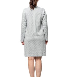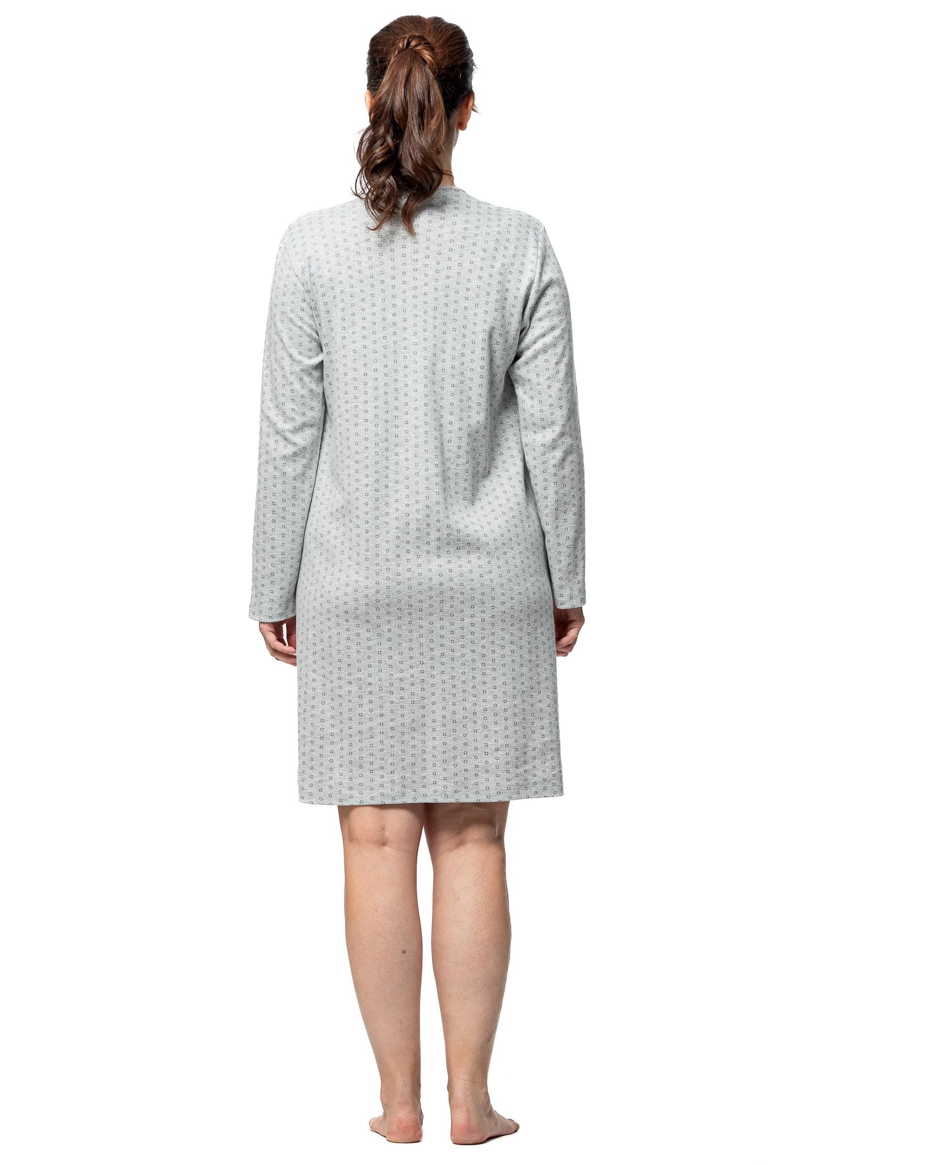 Camisón confeccionado en interlock de algodón y poliéster, un tejido suave, gustoso y muy duradero que aporta calidez y confort en cada uso. Diseño clásico de manga larga con cuello redondo y detalle de botones, ideal para ponérselo con facilidad y con un acabado femenino. Su estampado discreto le da un toque elegante y atemporal, perfecto para dormir o estar en otoño o invierno con total comodidad.