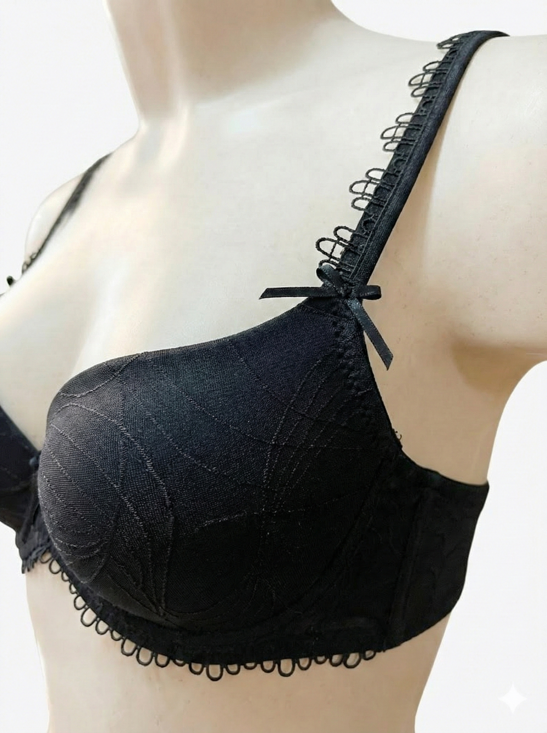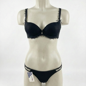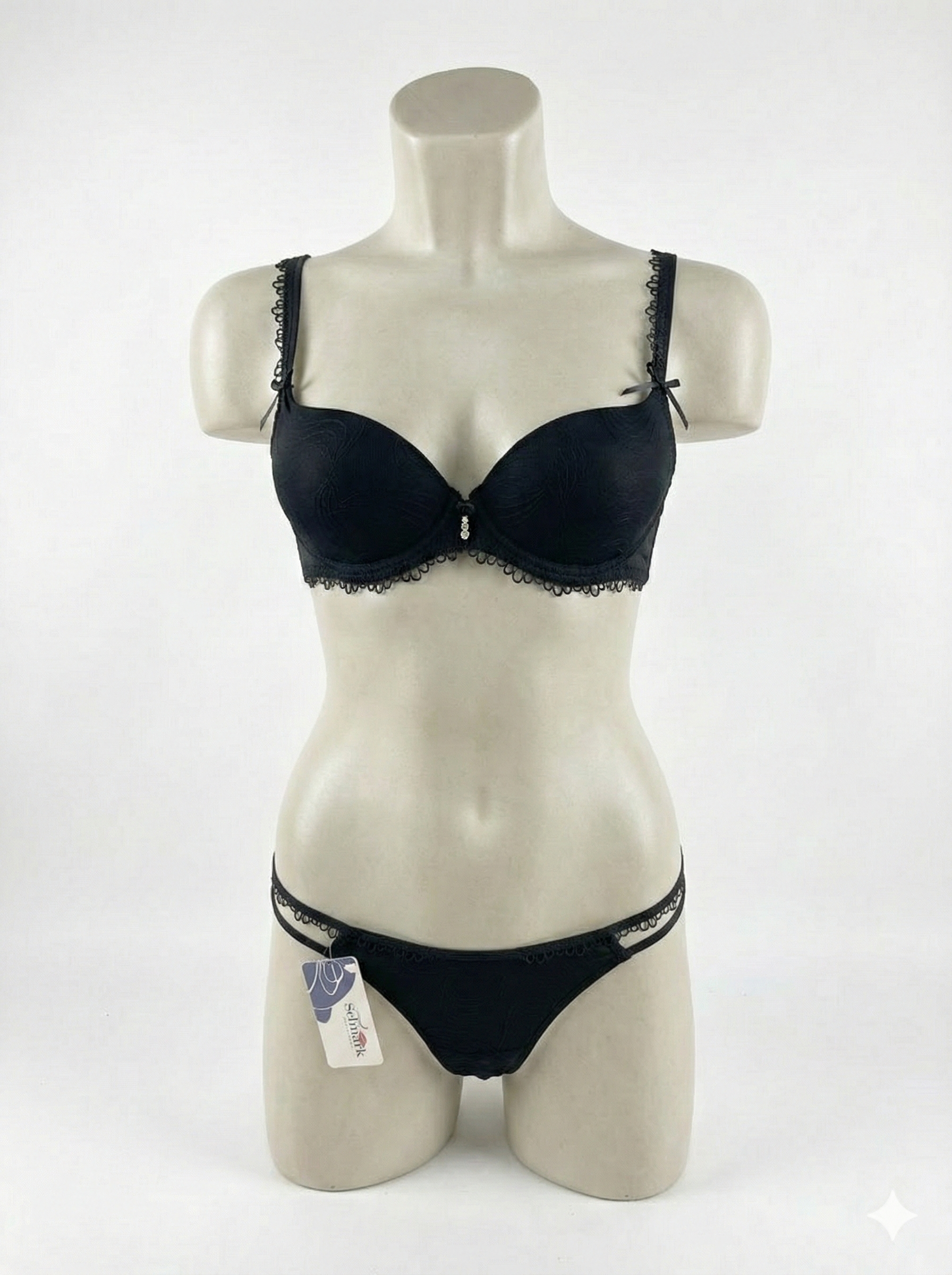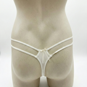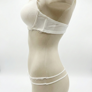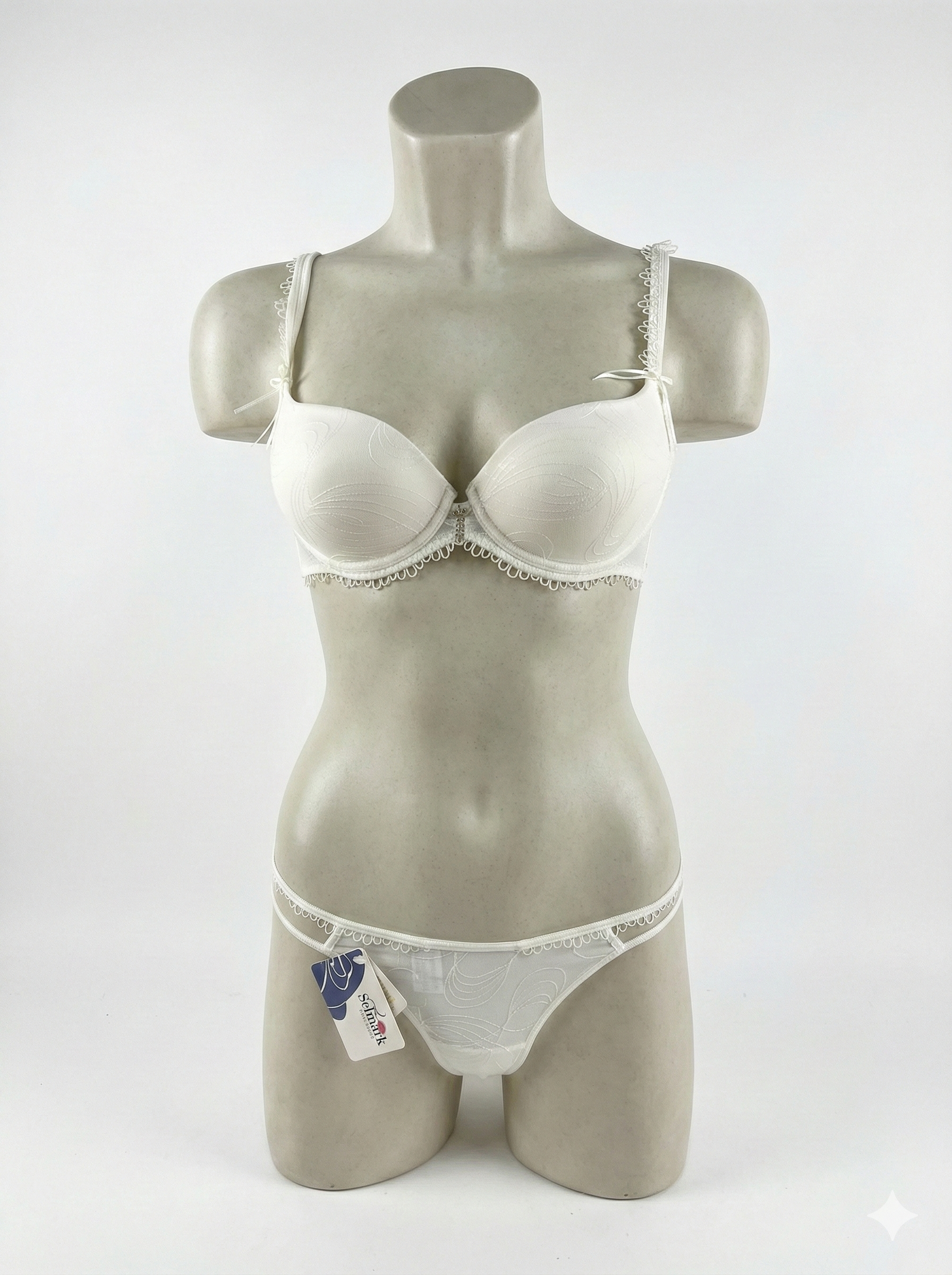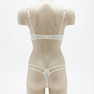 Conjunto Selmark 2017+2002 (Colección Elyse): sujetador preformado con aro, encaje/jacquard y escote profundo tipo plunge. Incluye braguita tanga de tul semitransparente con doble tira lateral “strappy” y lazo central. Colores disponibles: Marfil, negro, piel y ruby.