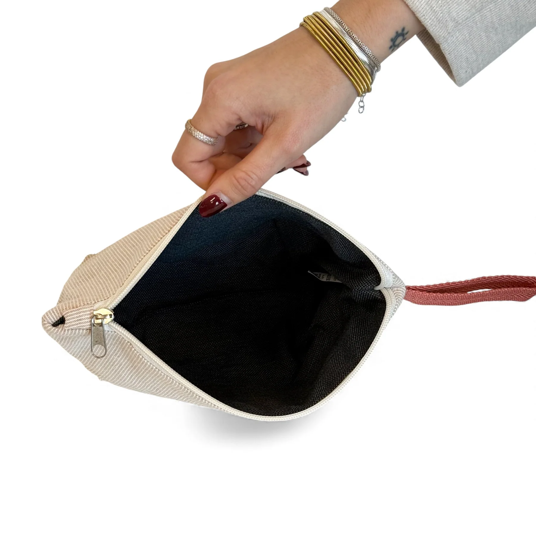 Se cierra con cremallera en la parte superior para un acceso cómodo y seguro, e incluye un asa lateral de cordón rosa que facilita transportarlo o sacarlo rápidamente de la maleta.