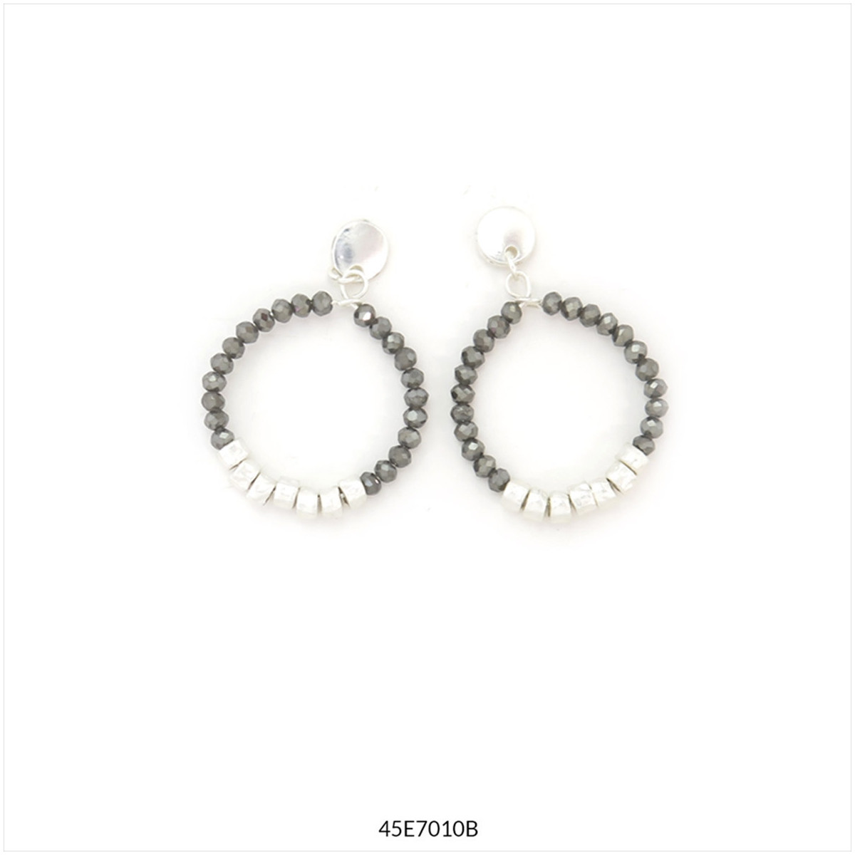 Su diseño en forma de aro de 2,5 cm de diámetro mezcla cuentas de cristal facetado en color gris con un detalle metálico en acabado plateado, creando un contraste sofisticado que ilumina el rostro sin recargar.