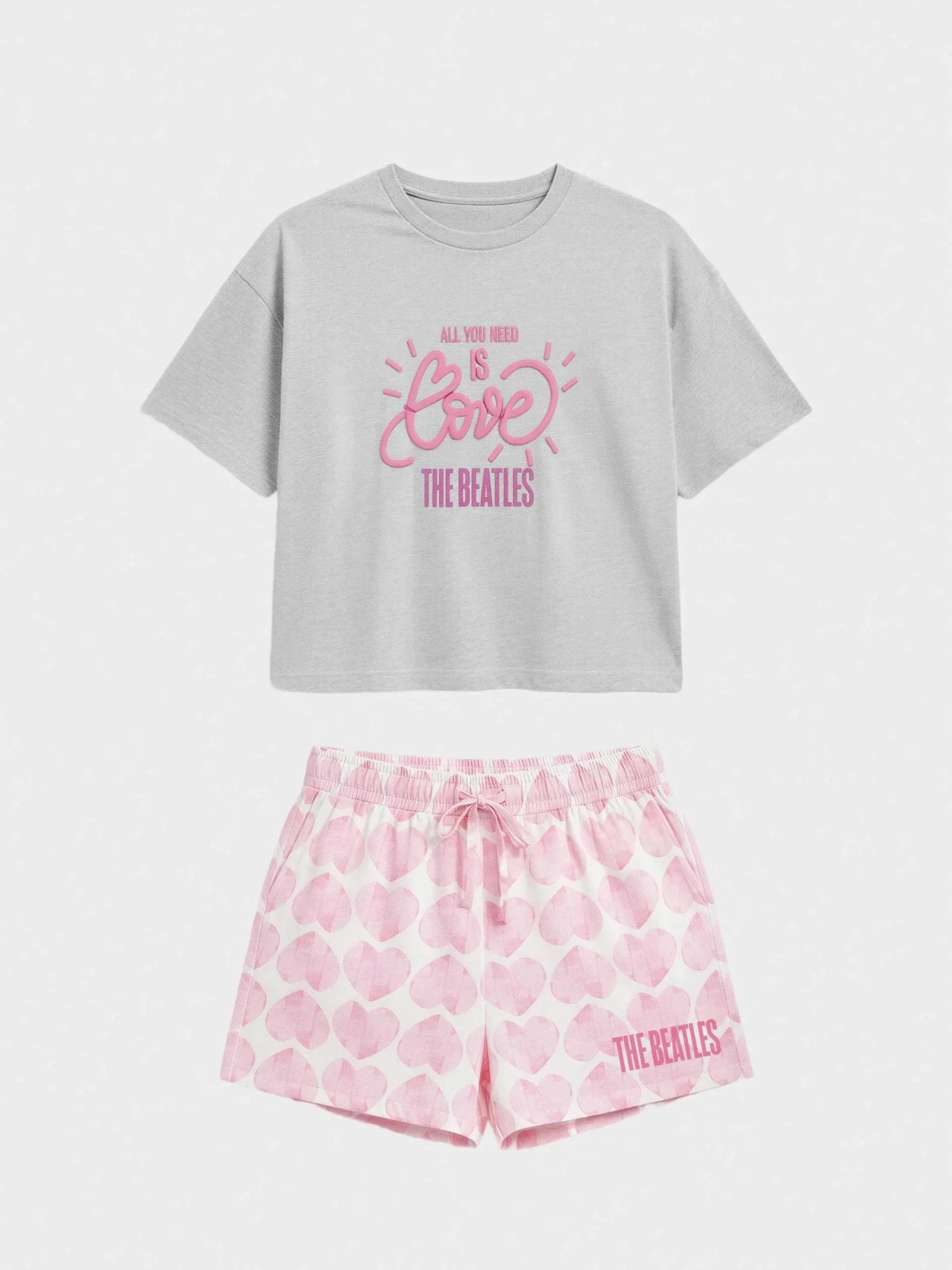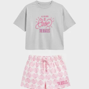 Pijama Gisela The Beatles en algodón 100%: camiseta manga corta con cuello caja y estampado con relieve, más short a contraste con corazones rosas, bolsillos laterales y cordón ajustable.
