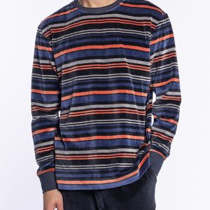 Camiseta de rayas en gris oscuro, con cuello redondo, manga larga y puños elásticos, proporcionando ajuste cómodo y una sensación envolvente de calidez.