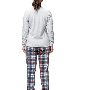 Un pantalón largo de cuadros en tonos marino, rojo y blanco, con goma en los bajos para mantener el pantalón en su sitio y aportar un ajuste más práctico, ideal para moverte por casa o descansar cómodamente.