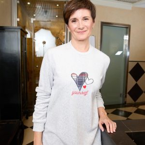Una camiseta gris jaspeada de manga larga, con un delicado bordado de corazón y mensaje en el pecho que le da un toque dulce y elegante.