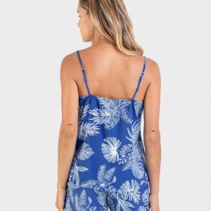 P221230. Pijama de mujer tipo lencero estampado con hojas sobre fondo azul