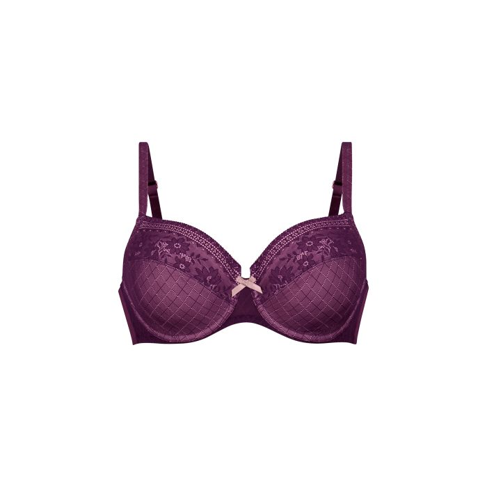 El sujetador presenta un diseño romántico que combina encaje plano de inspiración floral con un elegante patrón gráfico de cuadros.